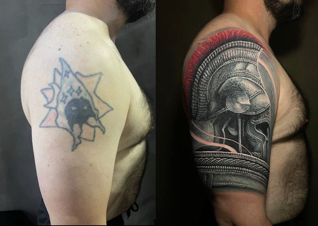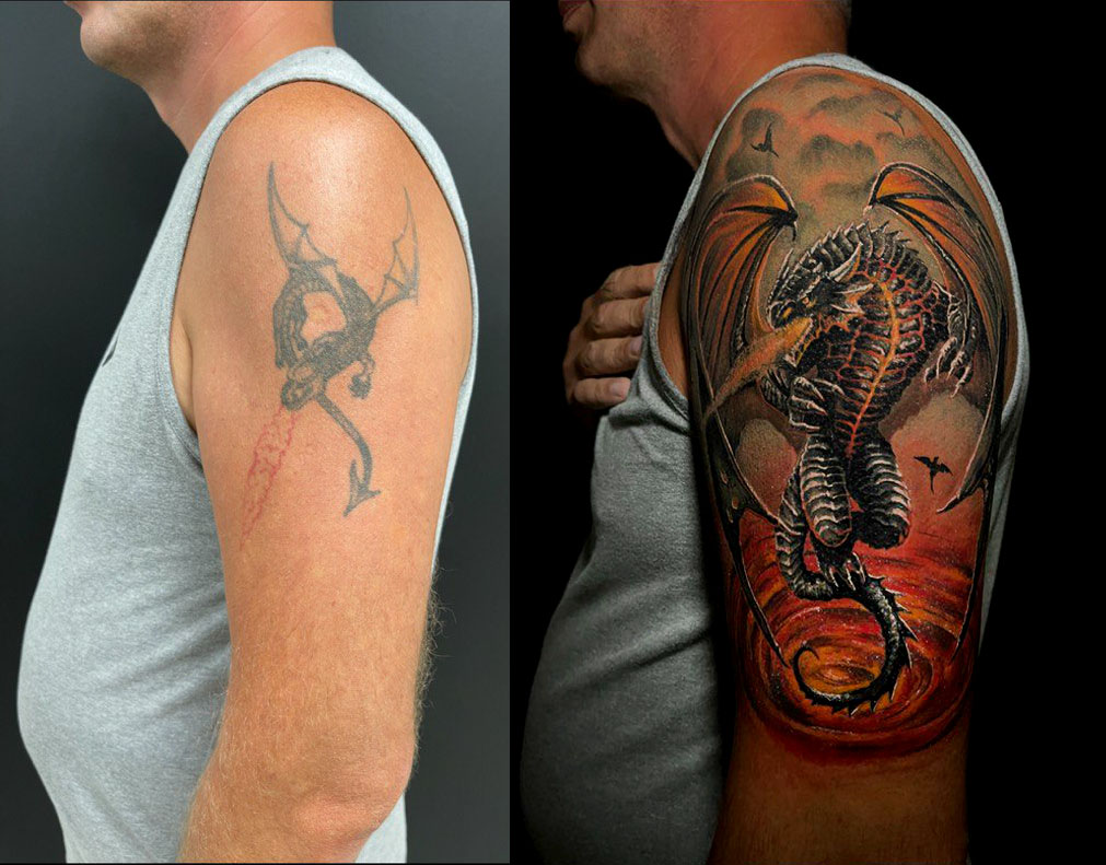 Профессионально закроем старую татуировку новым дизайном, полностью скрыв предыдущую работу