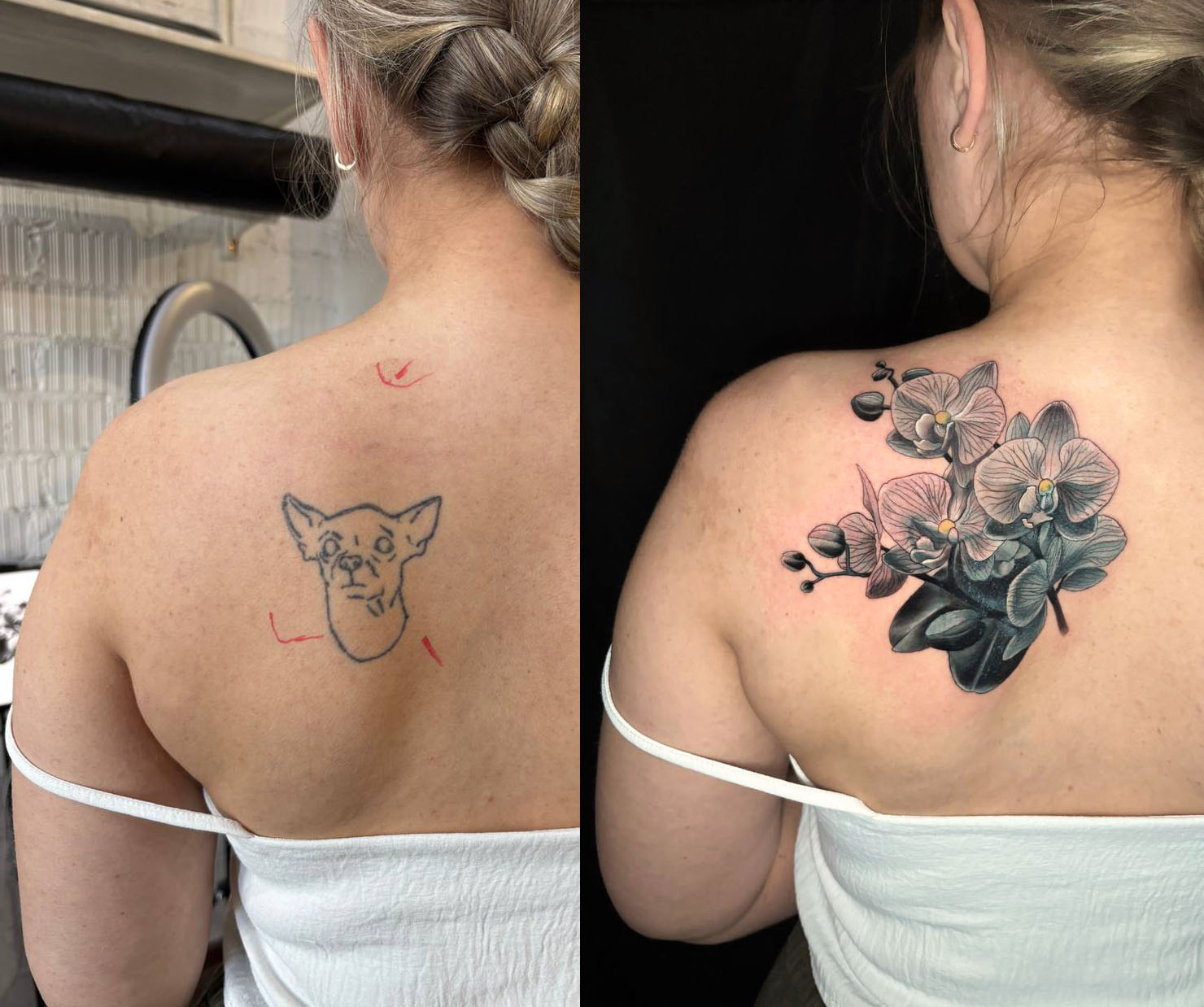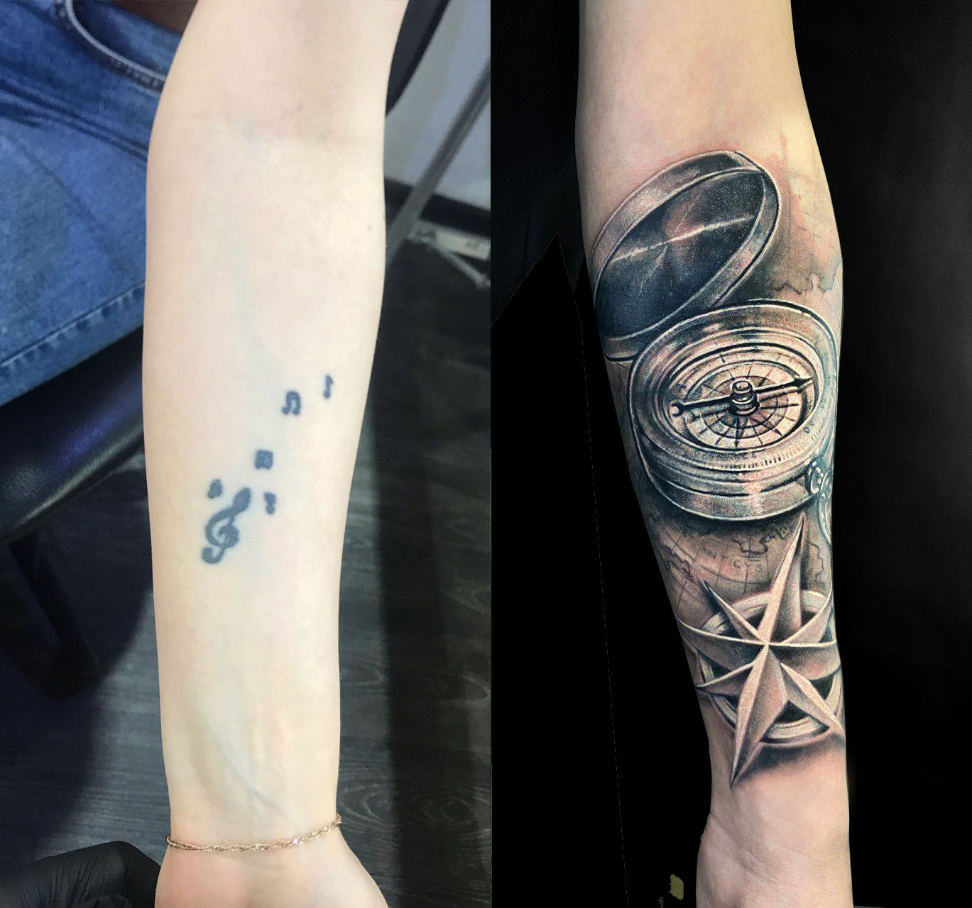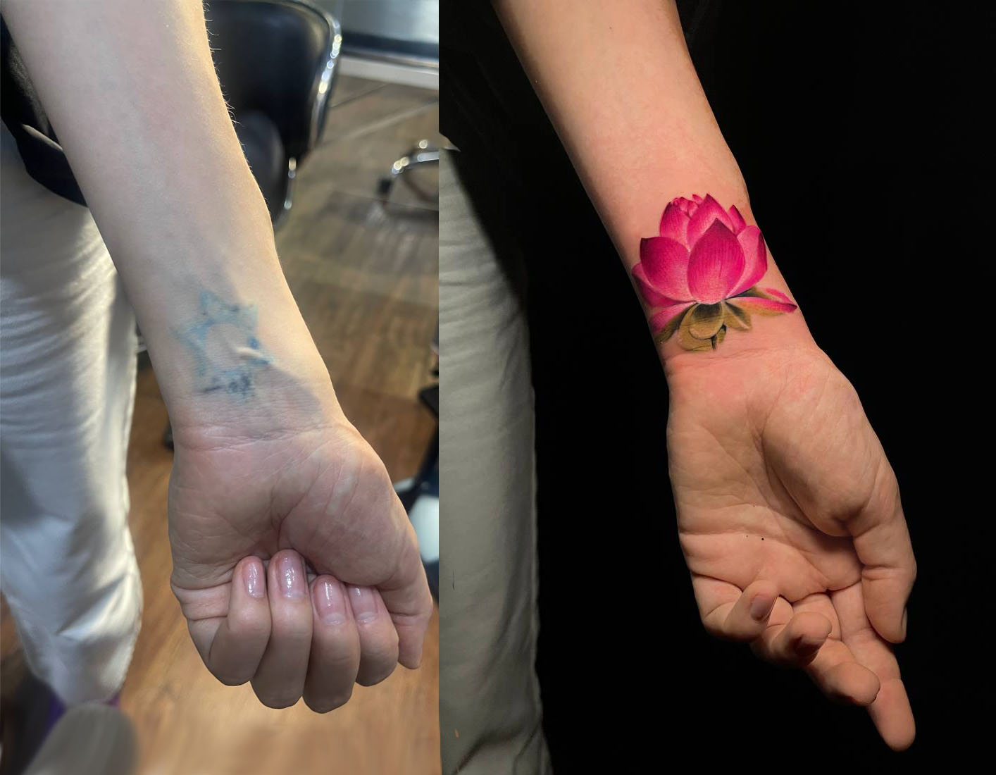 "Хочу поблагодарить Дмитрия за отличное перекрытие. Старое тату полностью исчезло под новым рисунком. Всё сделали грамотно и без боли."